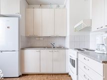 Jääkaappipakastin, perinteinen liesi, liesituuletin aktiivihiilisuodattimella, astianpesukone liitos, tasotilaa, kaapistot ja välitila laatoitettu.