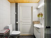 - 1krs: Erillinen wc: wc-istuin, allas, allaskaappi, kaapisto, peili, kiinteät valaisimet. Kylpyhuone/wc: suihku, wc-istuin, allas, allaskaappi, peili, kiinteät valaisimet, lattialämmitys (sähkö). Sähkösauna: lattialämmitys. Kodinhoitohuone: pesukoneliitäntä, allas, kaapistot/hyllyt, kulku ulos. 2krs.wc: wc-istuin, allas, allaskaappi, peilikaappi.