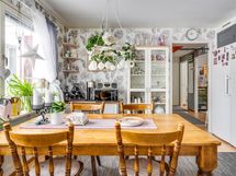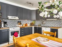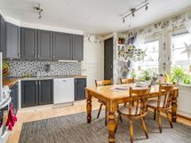 - Jääkaappi, pakastin, astianpesukone (1/2025), astianpesukoneliitäntä, keraaminen liesi/ kiertoilma uuni, liesituuletin hormiin, kaapistot (ovet maalattu puu), työtasot puuta, kiinteät valaisimet.
