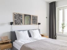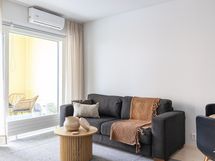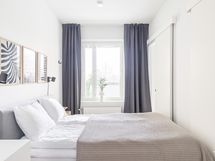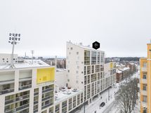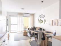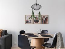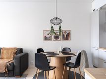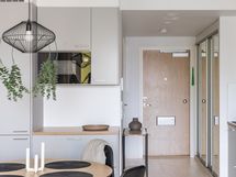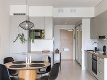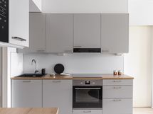 - Kauniissa keittiössä integroitu jääkaappi / pakastin, integroidut astianpesukone ja mikroaaltouuni, kiertoilmauuni induktiokeittotasolla, liesituuletin, kaapistot, parkettilattia, seinät maalattu.