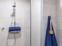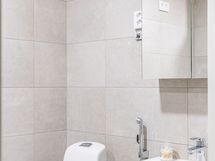 - Pesutilojen kuvaus: Suihku, suihkuseinä, wc-istuin, pesuallas, allaskaappi, peilikaappi, laattalattia, lattialämmitys, seinät kaakeloitu.
