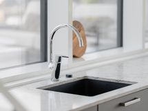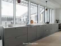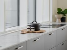 Keittiö on tiloiltaan ja materiaaleiltaan suunniteltu palvelemaan city-asunnon tyyliin. Kaikki tarvittavat materiaalit ja hyvät laskutilat ovat