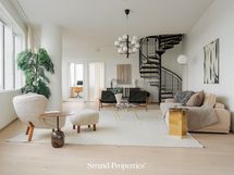 Astumalla sisään tähän huoneistoon huomaat sen modernin mukavuuden ja ainutlaatuisen persoonallisuuden. Asunnon kaksitasoisuus tuo erityistä avaruutta ja eleganssia. Avarat ja valoisat tilat tarjoavat myös henkeäsalpaavia näkymiä kaupungin ylle moneen eri suuntaan.