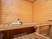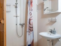 Kylpyhuoneessa on suihku, peilikaappi, pesukoneliitäntä ja kiinteät valaisimet.