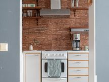 Kaapistot: valkoiset tasapintaiset alakaapit, ylhäällä hyllyt.