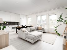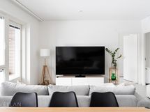Olohuoneen lattiat ovat vinyylilankku sävyltään beige eiche. Seinät ovat maalattuja.