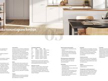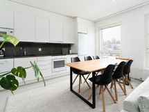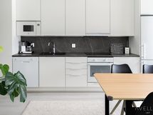 Liesi: induktio, erillisuuni. Työtasot: laminaatti. Kylmäsäilytys: jääkaappi/pakastin. Varustus: liesikupu, astianpesukone. Lattiat ovat vinyylilankku sävyltään Beige Eiche. Keittiön kaapistot ovat valkoiset ja työtaso sekä välitila on laminaattia sävyltään musta marmorikuvio. Valkoiset kodinkoneet.