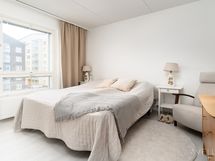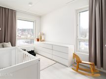 Makuuhuoneen lattiat ovat vinyylilankku sävyltään beige eiche. Seinät ovat maalattuja.