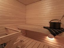 Kuvaus: Saunassa kuusipanelointi ja kuusilauteet. sähkökiuas