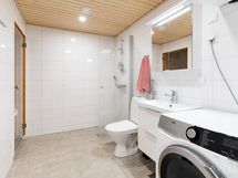 Pesutilojen kuvaus: Tilavan kylpyhuoneen seinät ovat laatoitettu valkoisella laatalla, paitsi tehosteseinä joka on vaalean harmaa. Lattiat ovat vaalean harmaat. Peili- ja allaskaappi ovat tammen väriset. . Varustus: suihkuseinä, pesukoneliitäntä, lattialämmitys, wc-istuin, suihku, peilikaappi.