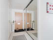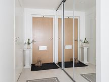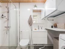 Asunnossa on kaksi wc:tä, toinen kylpyhuoneessa ja toinen erillinen wc. Säilytystilat ovat erinomaiset: liukuovikaapistot ja erillinen vaatehuone pitävät kodin siistinä ja toimivana. Lisäksi yhtiön tiloissa on oma häkkivarasto.