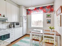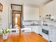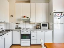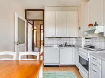 - Vaalea keittiö. Jääkaappi/pakastin (pieni pakastinosa), astianpesukone, sähköliesi, liesituuletin filtterillä, kaapistot, tiskipöytä terästä ja työtaso laminaattia.