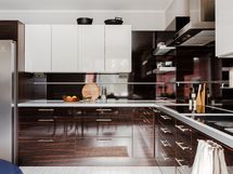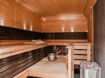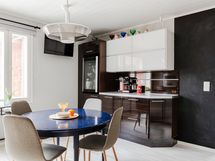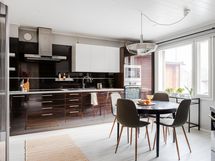 Liesi: induktio, erillisuuni. Työtasot: laminaatti. Kylmäsäilytys: jääkaappi/pakastin. Varustus: liesituuletin, mikroaaltouuni, astianpesukone. Todella tyylikäs ja laadukas keittiö.