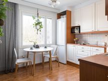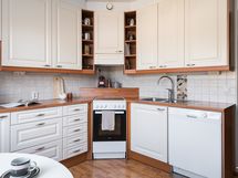 - Työtasot: laminaatti. Varustus: paikka mikrolle, jääkaappi/pakastin, keraaminen liesi kiertoilmauunilla, astianpesukone, liesituuletin (suodatin). Kaapistot: kerman väriset mdf.