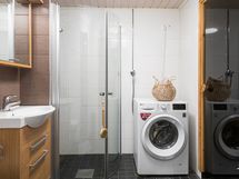 - Pesutilojen kuvaus: Varustus: allaslaatikosto, rättipatteri, wc, suihku, suihkuseinä (lokinsiivet), pesukoneliitäntä (mahtuu torni), lattialämmitys (huoneiston sähköön), peilikaappi ja kiinteät valaisimet. .