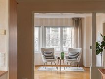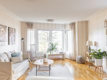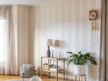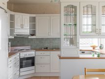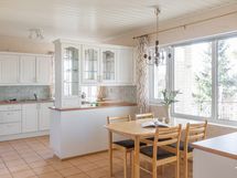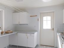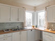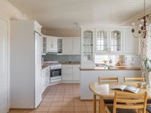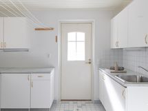 - Laattalattia, seinät tapetoitu, kaapistot, saareke, astianpesukone, liesitaso, uuni, liesituuletin, jääkaappi. Toinen jääkaappi ja pakastin kodinhoitohuoneessa.