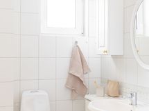Yläkerran wc: lattia ja seinät laatoitettu, bidee-suihku, allas, allaskaapisto, kaapit, peili, lattiakaivo.