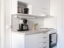 Keittiössä : jääkaappipakastin, lattialiesi, liesikupu, kaapistot ja kiinteät valaisimet.