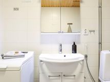 Pesuhuone: suihku, suihkuseinä, peilikaappi, allaskaappi, lattialämmitys sekä kiinteät valaisimet.