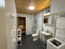 Suihku, Pesukonevalmius, Peilikaappi, Laattalattia, Laattaseinä, Lattialämmitys