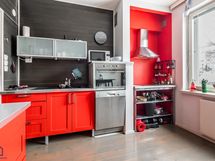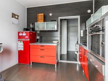 - Keittiön varusteet: Jenkkikaappi, liesituuletin, liesi, erillisuuni ja astianpesukone. Työtason materiaali: Laminaatti.
