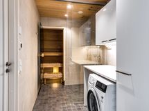- Pesuhuoneessa kodinhoitonurkkaus, tulpasuihku, sauna. Lisäksi erillinen wc. Lattia: Laatta. Seinät: Laatta
