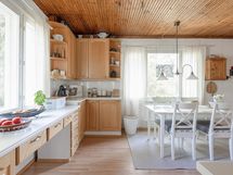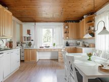 - Jääkaappi, pakastekaappi ja kylmiö (kellarikerroksessa), keraaminen liesi (uusittu 2022), liesituuletin, leivinuuni (kellarikerroksessa), astianpesukone, kaapistot, kiinteät valaisimet (työtasovalaisin).