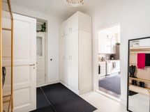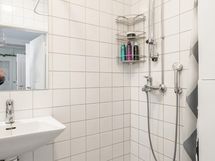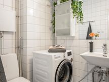 - Kylpyhuoneessa on suihku, peili, pesuallas, seinäkaappi ja pesukoneliitäntä. Kylpyhuoneen mukavuuslattialämmitys huoneiston sähkölaskuun (lisätty yhtiön putkiremontin aikana).