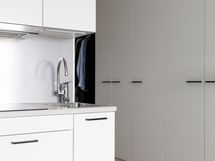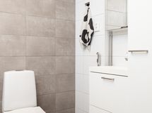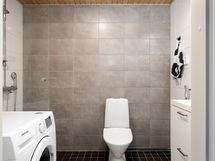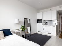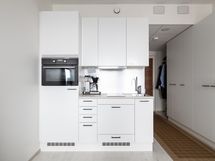 Asunnon pinnat ovat lähes uutta vastaavassa kunnossa. Vaikka neliöt eivät päätä huimaa, on hyvällä tilasuunnittelulla saatu keittiöön mahtumaan kaikki mitä tarvita saattaa: kalusteisiin integroituna jääkaappi, pakastelokero, astianpesukone, uuni ja induktioliesi.