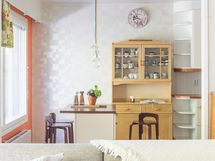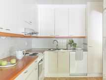- Kodikkaassa keittiössä jääkaappi, pakastekaappi, sähköliesi, liesituuletin (hormiin), astianpesukone, kaapistot, saareke, parkettilattia, seinät tapetoitu. Keittiö remontoitu edellisen omistajan toimesta, vuodesta ei tietoa. Myyjän toimesta kaikki alalaatikostot uusittu, korkeaan kaappiin laatikostot uusittu sekä saareke 2022.