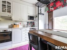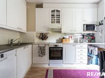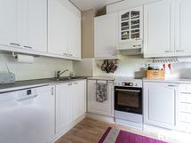 - Keittiön varusteet: Jääkaappi, erillinen pakastin, astianpesukone, liesituuletin ja liesi. Liesi: Keraaminen liesi. Työtason materiaali: Laminaatti.