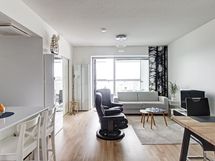 - Jääkaappi/viileäkaappi, pakastekaappi integroituja, induktioliesi, kiertoilmauuni, astianpesukone integroitu, kvartsikivitasot, kaapistot, saareke, liesikupu/-tuuletin