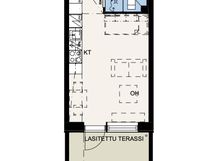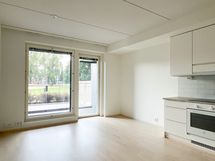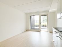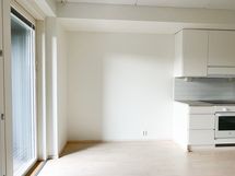 Asunnossa on yhtenäinen oleskelu- ja keittiöttila ja värimaailma on kauniin harmoninen. Keittiön välitilassa on tyylikäs laatoitus ja varustukseen kuuluu keraaminen liesi, astianpesukone sekä jääkaappipakastin. Säilytysitilaa löytyy hyvin sekä keittiöstä, eteisestä että oleskelutilan yläkaapeista. Asunnolle kuuluu myös erillinen irtaimistovarasto. Kylpyhuone on tilava ja siellä on liitäntä pyykinpesukoneelle.