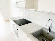 Liesi: keraaminen. Työtasot: laminaatti. Kylmäsäilytys: jääkaappi/pakastin. Varustus: liesikupu, astianpesukone.