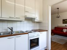 Keittiössä : Jääkaappipakastin, lattialiesi, liesikupu, kaapistot ja kiinteät valaisimet.