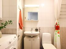 Kylpyhuoneessa : WC, suihku, peilikaappi, kaapisto, allaskaappi, pyyhepatteri, pesukoneliitäntä ja kiinteät valaisimet.