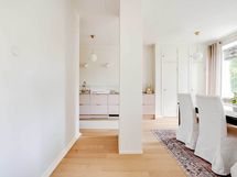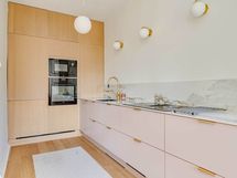 - Induktiokeittotaso integroidulla liesituulettimella, astianpesukone, jää- pakastinkaappi, mikroaaltouuni ja kiertoilmauuni. Kaikki kodinkoneet integoitu. Nuovo Corso Marmo Antico keraaminen pöytätaso. Aamiaiskaappii täydentää kokonaisuuden, Epoq -keittiö suunniteltu omien tarpeiden mukaan. Lattia: Meister PS 300 tammi Pure Harmonic tammipaketti, mattalakattu ja harjattu. Seinät: Maalattu