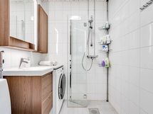 - Suihku, suihkuseinä, pesukoneliitäntä, kylpyhuonekaapisto. Lattia ja seinät laatoitettu.