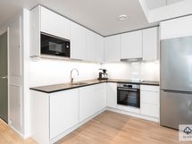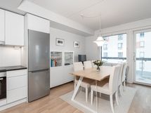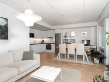 Tässä kodissa on jokainen yksityiskohta tarkoin mietitty. Erinomainen pohjaratkaisu tekee asunnosta avaran ja käytännöllisen. Kaunis avoin keittiö yhdessä ruokailutilan ja oleskelutilan kanssa muodostaa asunnon sydämen, johon suuret ikkunat päästävät paljon luonnonvaloa ja josta on kulku viihtyisälle parvekkeelle. Ruokailutilaan mahtuu isompikin ruokapöytä ja oleskelutila muutettavissa tarpeen mukaan makuuhuoneeksi. Arkea helpottaa käytännöllinen pesuhuone/kodinhoitohuone. Makuuhuoneen ja eteisen kaapistot tuovat asuntoon säilytystilaa.