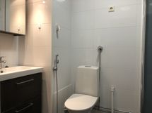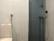 - Laatoitetussa kylpyhuoneessa seinät ja lattia laattaa. Wc-istuin, suihkuseinä, suihku, paikka pesukoneelle, allas- ja peilikaappi.