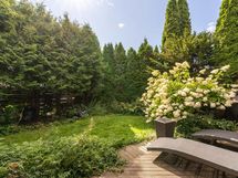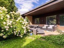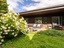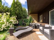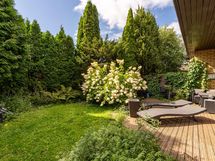 - Vehreä, Tuijien reunustama suojaisa olopiha.
