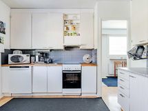 - Kaapistot, jääkaappi/pakastin, keraaminen liesi, astianpesukone, liesituuletin/ aktiivihiilisuodatin