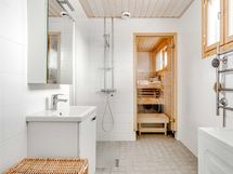 - Kylpyhuone, suihku, suihkuseinä, sähkösauna, wc-istuin, lattialämmitys sähkövastuksilla, pyyhekuivain, peilikaappi, allaskaappi, pesukoneliitäntä, pyyhekuivain, erillinen wc. Kylpyhuoneessa ikkuna.