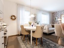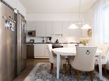 - Keittiön varusteet: Jääkaappi, erillinen pakastin, astianpesukone, liesi, liesituuletin ja mikroaaltouuni. Työtason materiaali: Kivi.
