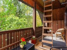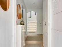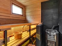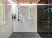 - Kylpyhuone/sauna, 2 eriilistä wc-tilaa. Kylpyhuone kokonaan laatoitettu, 2 suihkua, saunan ja kylpyhuoneen välissä lasiseinä, kylpyhuoneessa on ikkuna. Saunan lattia laattaa, seinät ja katto paneloitu, puulämmitteinen kiuas. Alakerran wc kokonaan laatoitettu, allaspiste seinäwc-istuin. Yläkerran wc:n lattia laattaa, seinät maalattu, wc-istuin, varaus suihkukaapille.