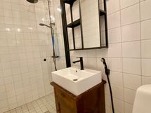 - Suihkuseinä, Pesukonevalmius, Peilikaappi, Allaskaappi, Laattalattia, Laattaseinä, Lattialämmitys