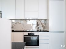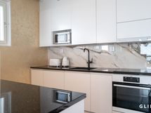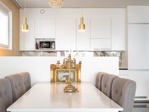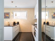 Liesi: induktio, erillisuuni. Työtasot: kivi. Kylmäsäilytys: jääkaappi/pakastin. Varustus: liesituuletin, astianpesukone.