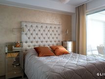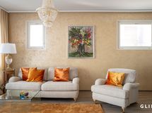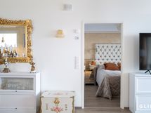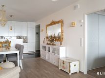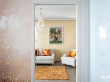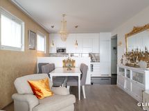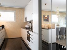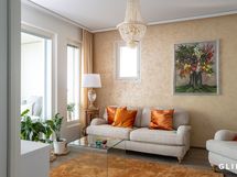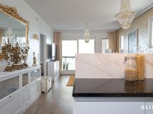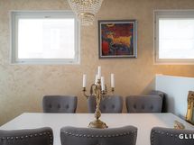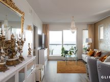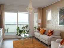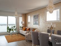 Olohuoneessa on tilaa reilusti myös ruokaryhmälle. Huoneistossa ikkunat myös sivuilla, joten asunto on erityisen valoisa. Saarekkeella erotetussa avokeittiössa on hyvin laskutilaa, kivitasot, upea laattalattia ja keittiön välitilan marmorilaatta sekä vaaleat kaapistot ovat kaunis ja toimiva kokonaisuus. Tilavassa makuuhuoneessa on isot vaatekaapit ja rauhalliset maisemat jatkuvat läpi huoneiston.