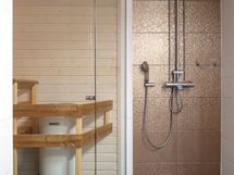 Upeasti laatoitetussa kylpyhuoneessa on viimeistellyt yksityiskohdat ja toki asunnosta löytyy myös oma sauna.