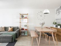 - Iso olohuone, jossa hyvä tila isolle ruokapöydälle. Käynti parvekkeelle. Seinät: tapetti, maalattu Lattiat: Vinyylikorkki.